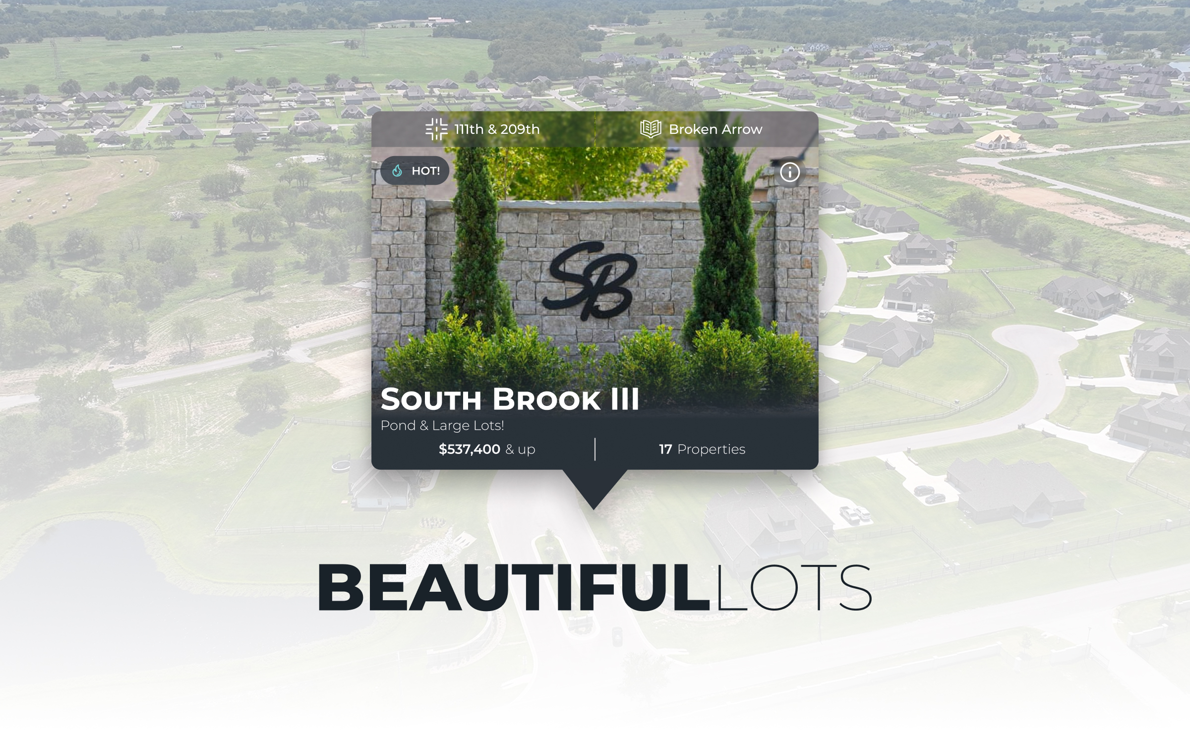 South BrookLocation111th & 209thPrice Range$545,000-$915,000School DistrictBroken ArrowLot SizeHalf AcreAmenitiesLarge LotsPondCurrent
